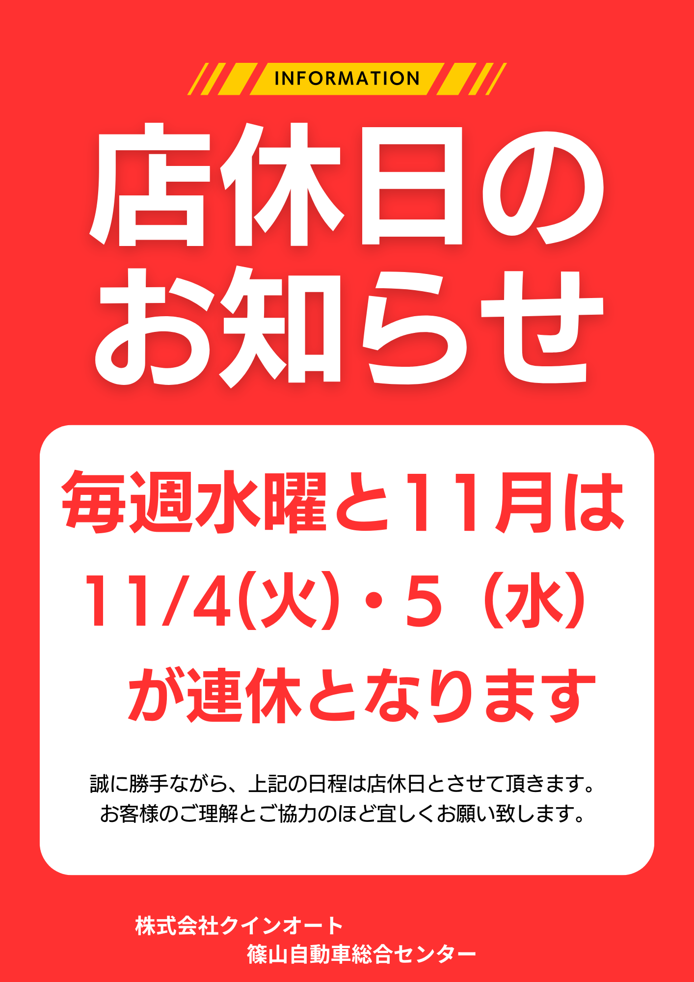 毎週水曜日と、11月の店休日は 4日(火)5日(水)が連休となります。
